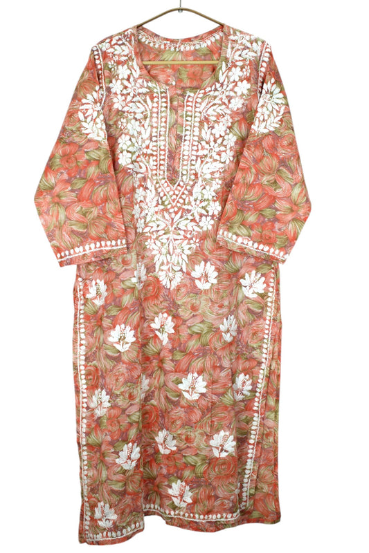 LIYANA ORANGE MULMUL LONG KURTA WITH 3D CHIKANKARI