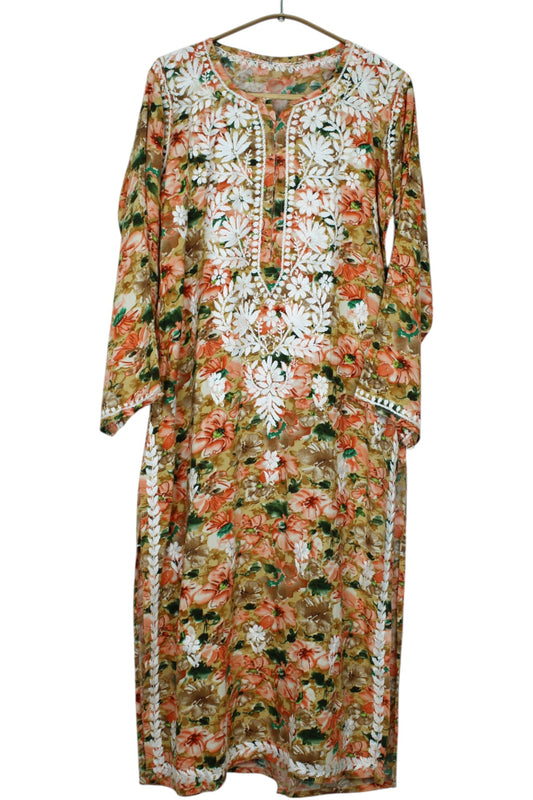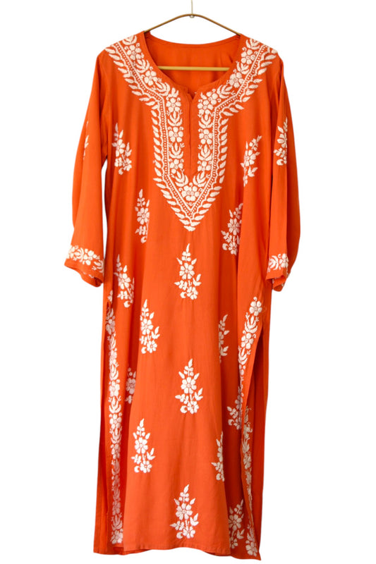 HINA ORANGE LONG PRINTED RAYON CHIKANKARI KURTA