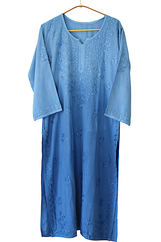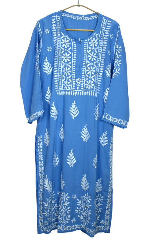 HINA BLUE LONG PRINTED RAYON CHIKANKARI KURTA