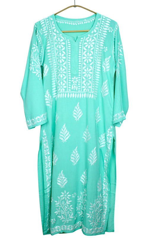 HINA GREEN LONG PRINTED RAYON CHIKANKARI KURTA