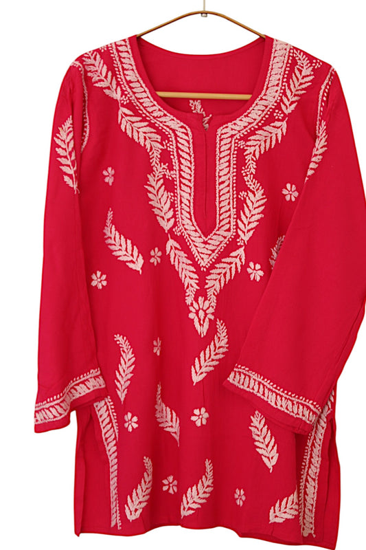 CORAL RED RAYON CHIKANKARI SHORT TOP