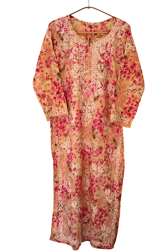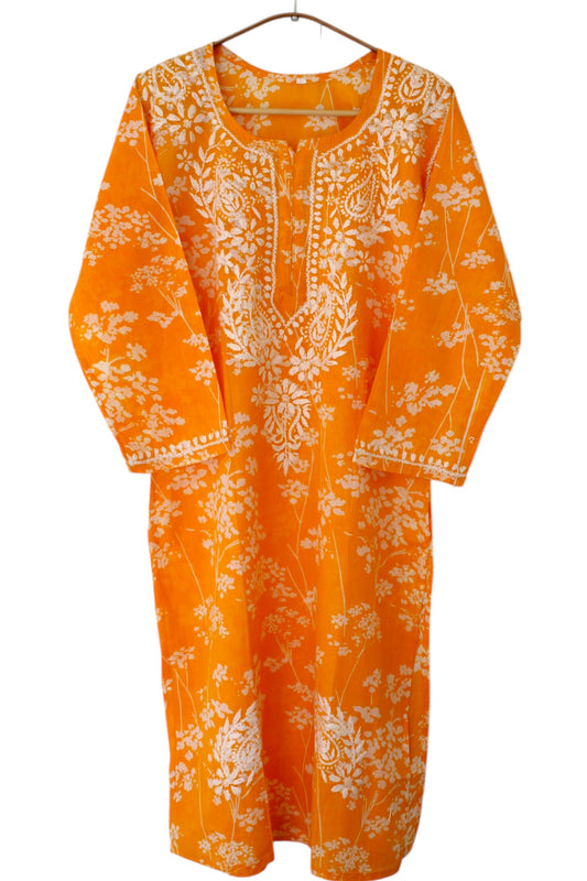 HINA ORANGE LONG PRINTED RAYON CHIKANKARI KURTA