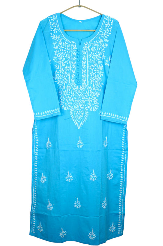HINA BLUE LONG PRINTED RAYON CHIKANKARI KURTA